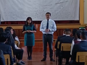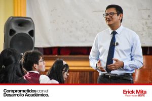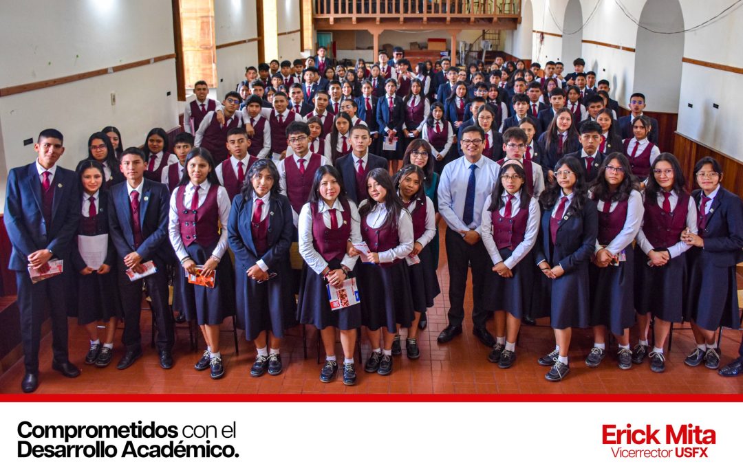El Vicerrector de la Universidad, Dr. Erick Mita Arancibia, junto a la Directora de la Diseru, Lic. Madai Moscoso Serrudo, visitaron a estudiantes proximos a ser bachilleres de la unidad educativa, La Recoleta, con el propósito de brindarles información de los perfiles profesionales de las carreras de la USFX y aclarar dudas de los jóvenes estudiantes respectos a las modalidades de ingreso, becas ofertadas y servicio de salud para universitarios.