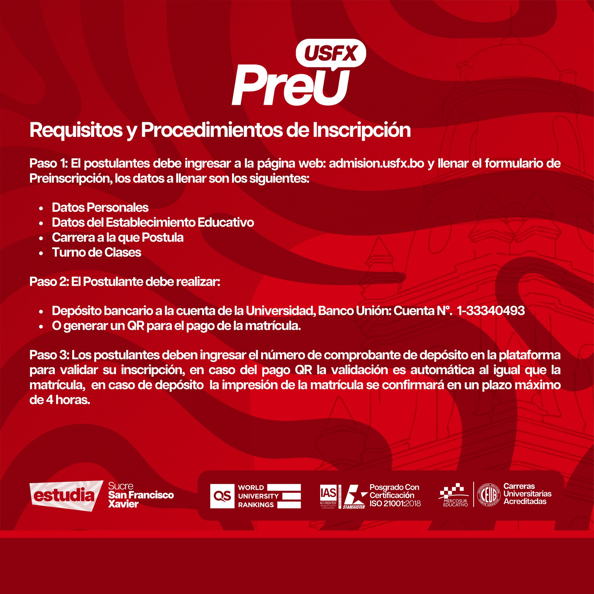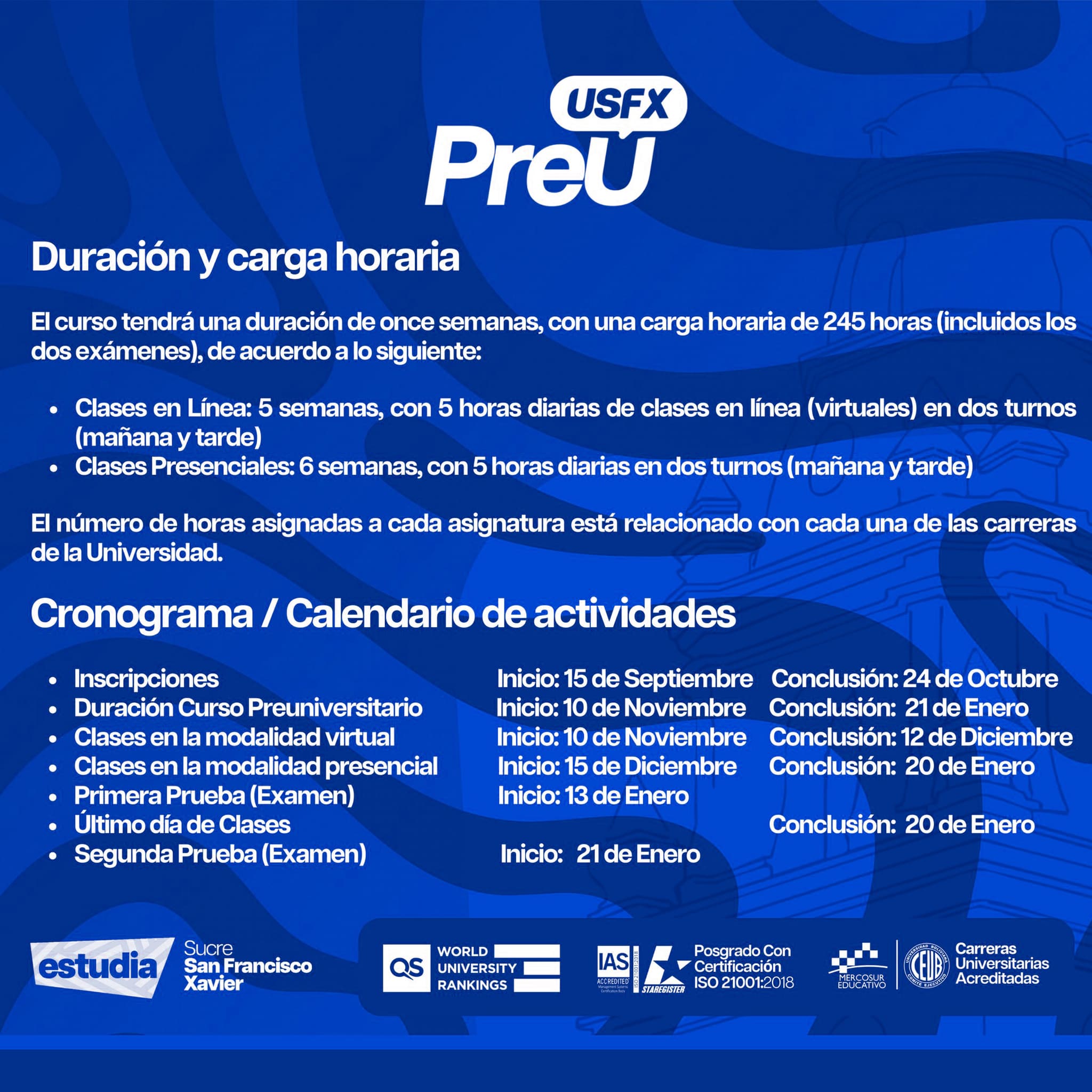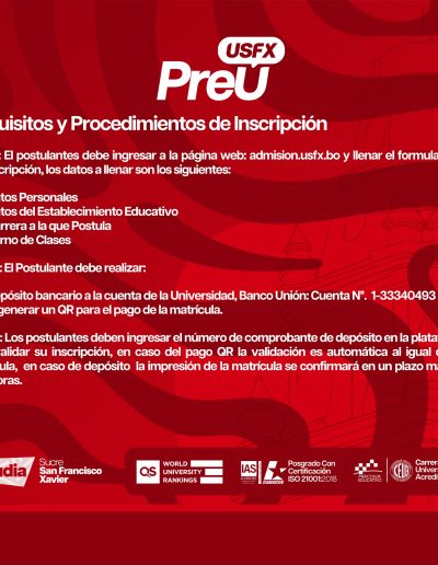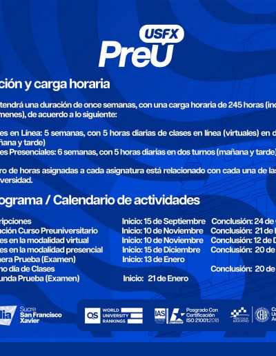 Podrás asistir a presentaciones detalladas sobre los programas de estudio de la Universidad San Francisco Xavier, conocer los requisitos de ingreso y descubrir las oportunidades de desarrollo profesional en cada disciplina. Ya sea que te interese la ingeniería, la medicina, el diseño, la educación u otra área, estas jornadas te proporcionarán toda la información que necesitas.